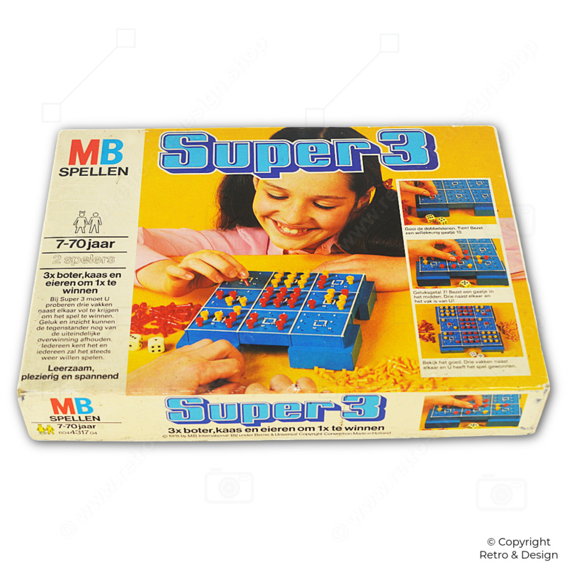De Milton Bradley Company bracht in de jaren β70 tal van innovatieve bordspellen uit. Super 3 is een speelse twist op het klassieke boter-kaas-en-eieren, dat al eeuwenlang bekend is als eenvoudig strategiespel voor twee spelers.