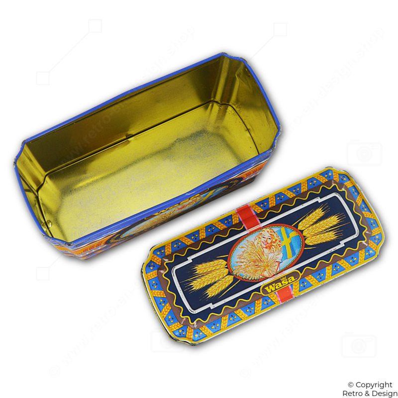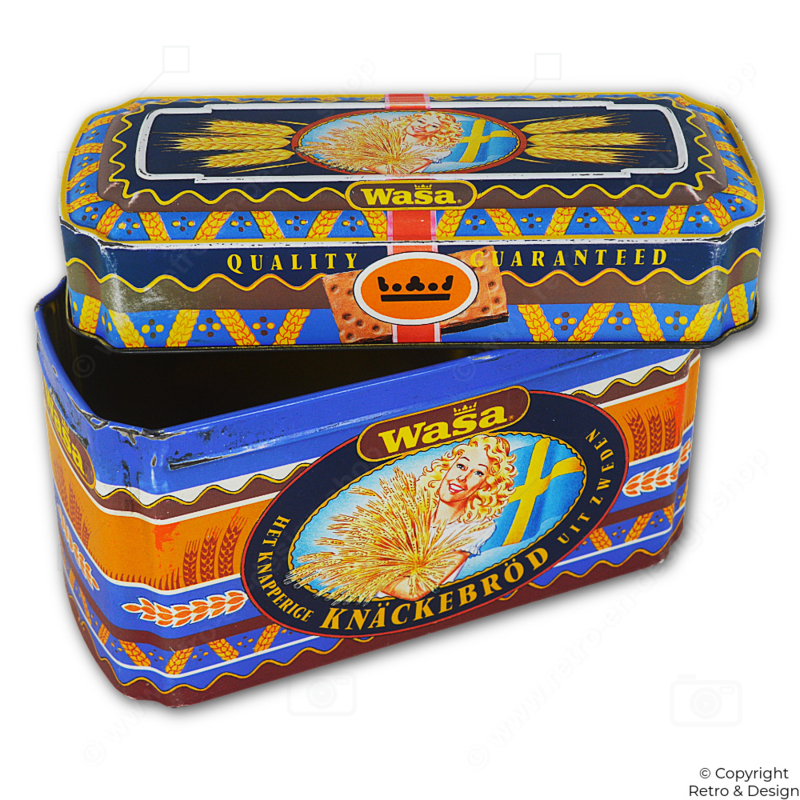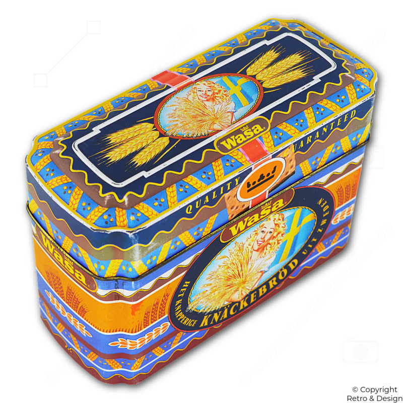 • Kleurrijk rechthoekig bewaarblik van Wasa uit de jaren ’90, speciaal ontworpen voor knäckebröd.