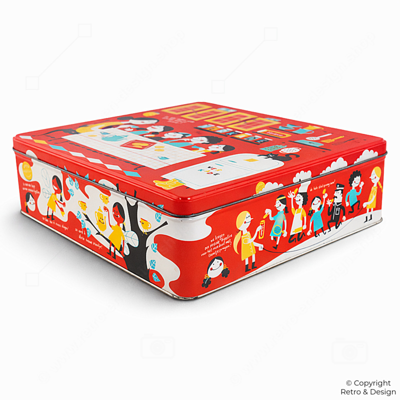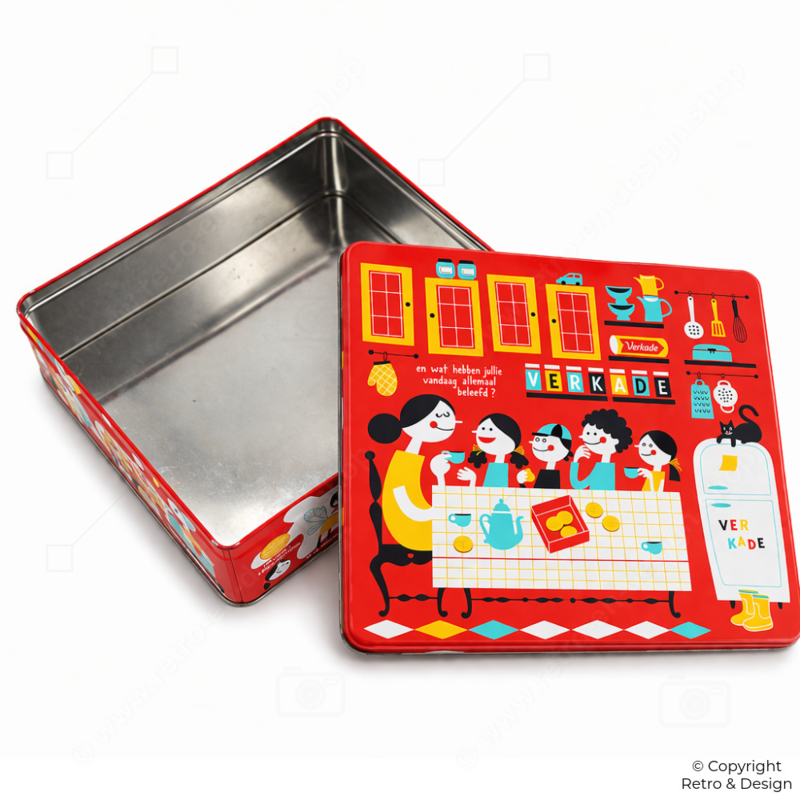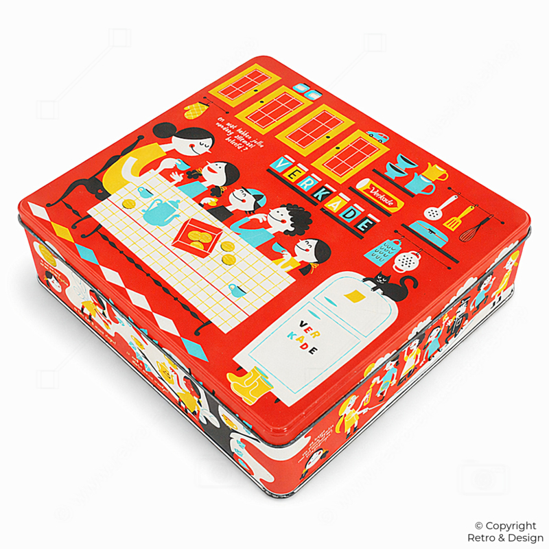 Door het vrolijke ontwerp is het blik niet alleen praktisch, maar ook een decoratief verzamelobject voor liefhebbers van Verkade en nostalgisch Nederlands design.