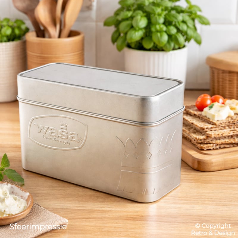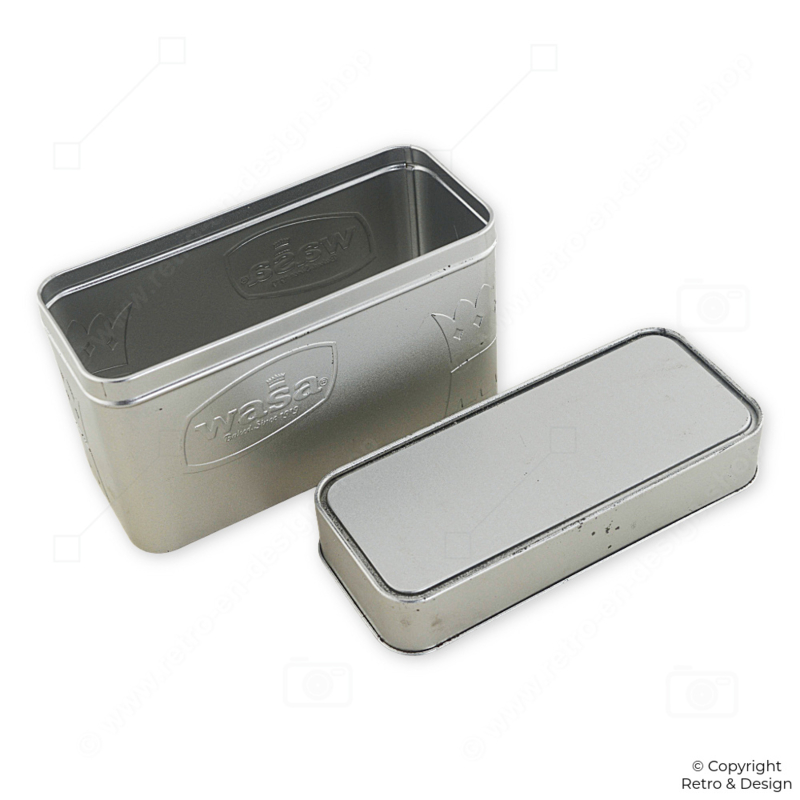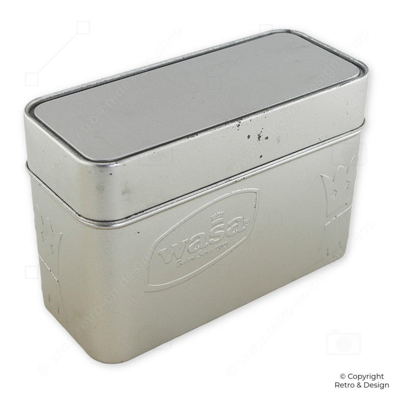 • Een fraai zilverkleurig WASA bewaarblik uit de periode 1989–2000.