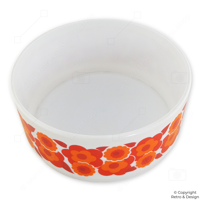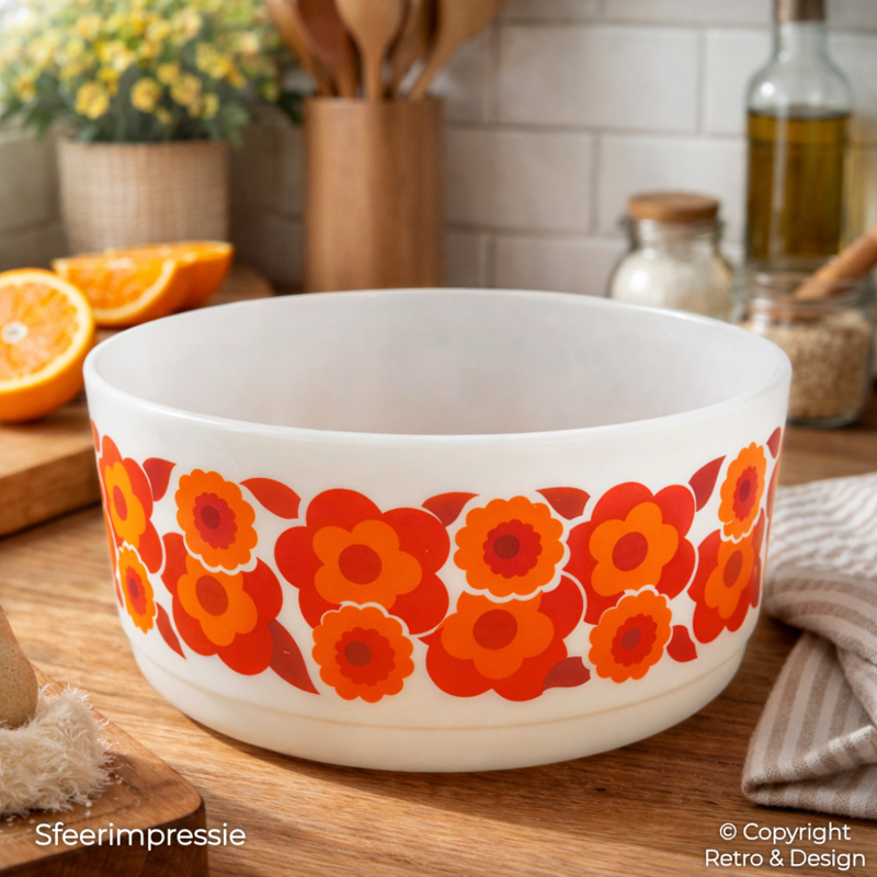 Deze ruime Arcopal schaal is een echte blikvanger dankzij het warme ‘Lotus’ bloemdecor in typische jaren 70 kleuren. Perfect voor het presenteren van fruit, salades of gerechten uit de oven.