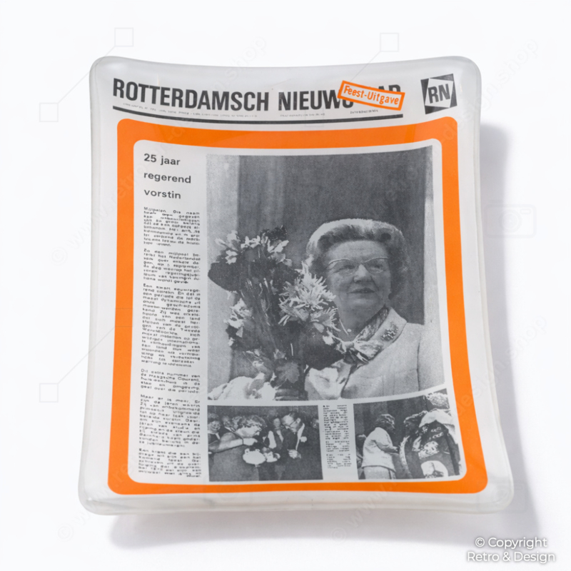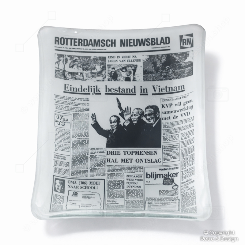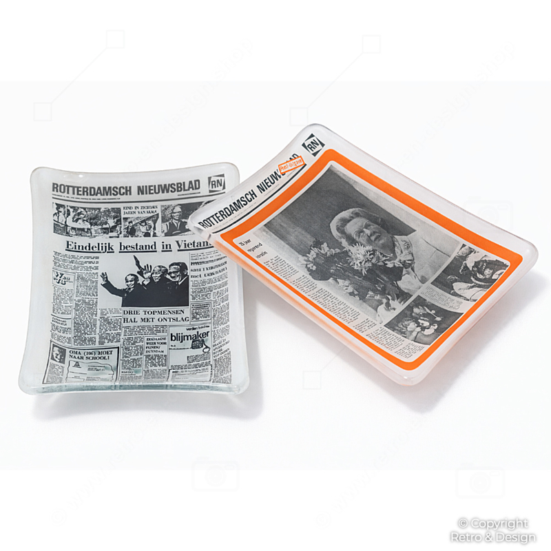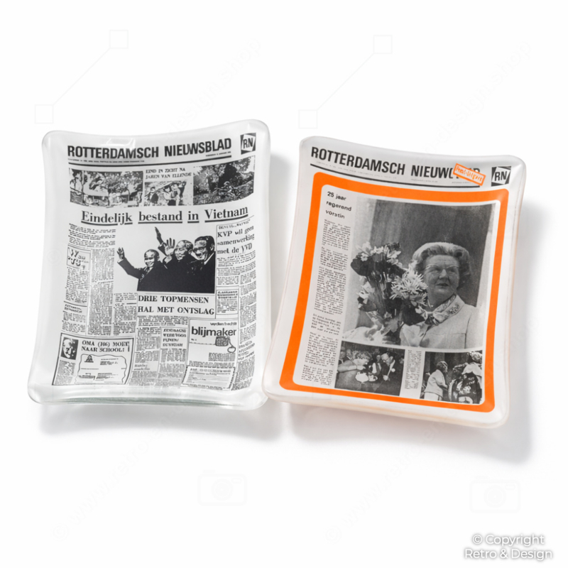 Deze bijzondere glazen asbakjes uit het begin van de jaren 70 zijn voorzien van een afbeelding van het voorblad van het Rotterdamsch Nieuwsblad. Daardoor hebben ze niet alleen een praktische functie, maar ook een nostalgische en decoratieve uitstraling.