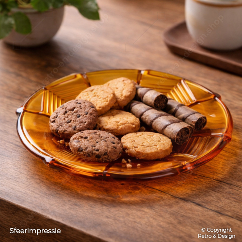 Deze vintage glazen schaal combineert functionaliteit met een krachtige retro uitstraling. Dankzij de vrij platte vorm is de schaal ideaal voor het serveren van gebak, koekjes of hapjes, maar ook zeer geschikt als decoratief object op tafel of dressoir.