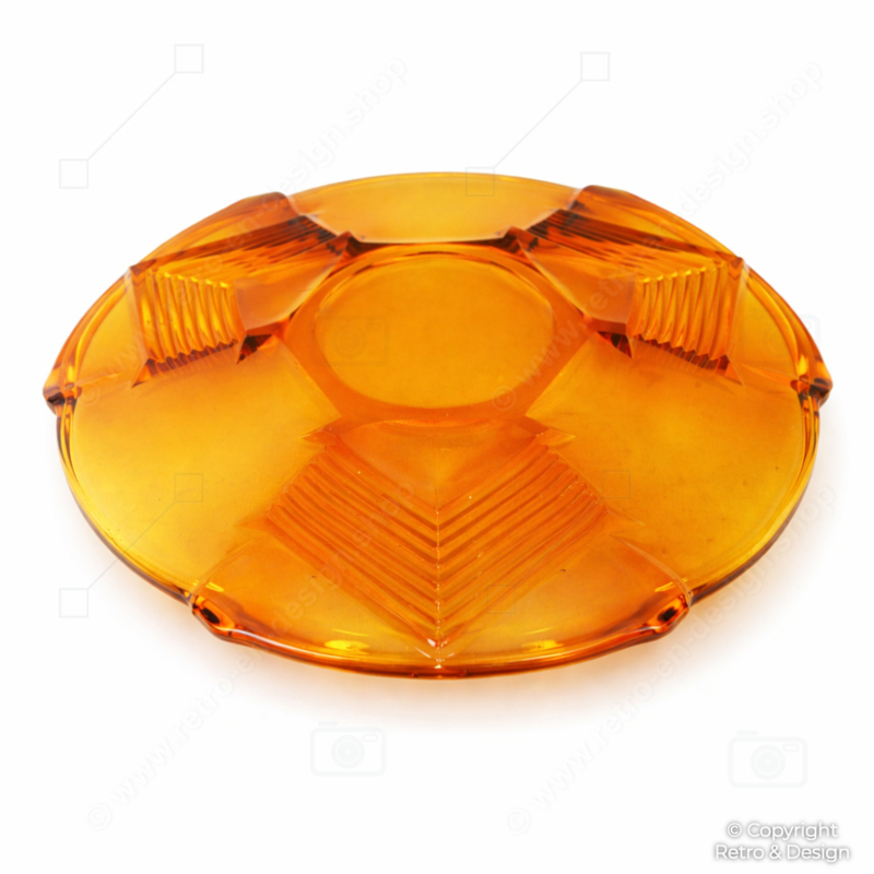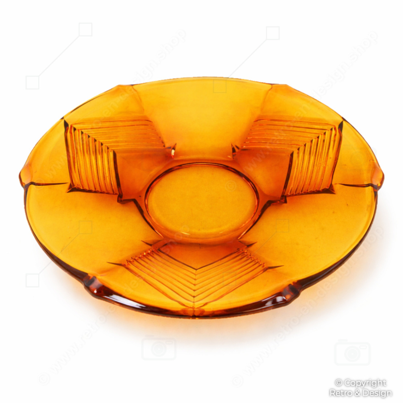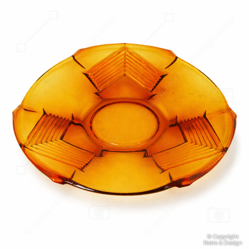 • Sfeervolle vintage schaal van amberkleurig persglas met geometrisch reliëf