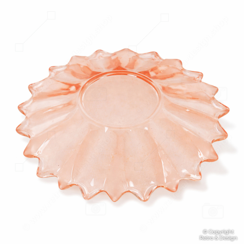 • Elegante vintage glazen schaal in een zachte peach/roze tint, uitgevoerd in een sierlijke bloemvorm met golvende rand. Een subtiele blikvanger met een warme, romantische uitstraling.
