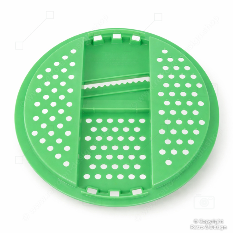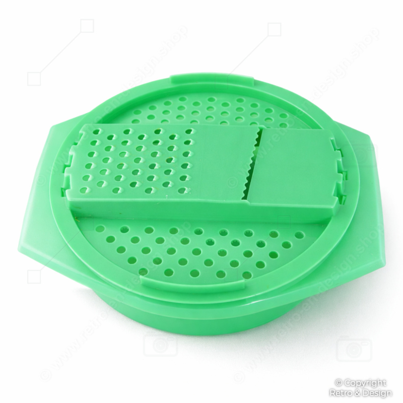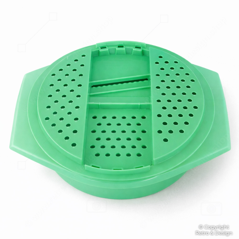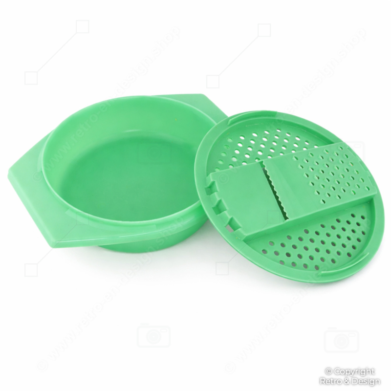 Praktische vintage Tupperware mandoline met bijpassende kom. Ideaal voor het snel snijden, raspen en voorbereiden van groenten, fruit of kaas – rechtstreeks boven de schaal.