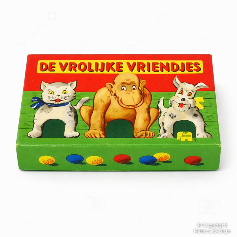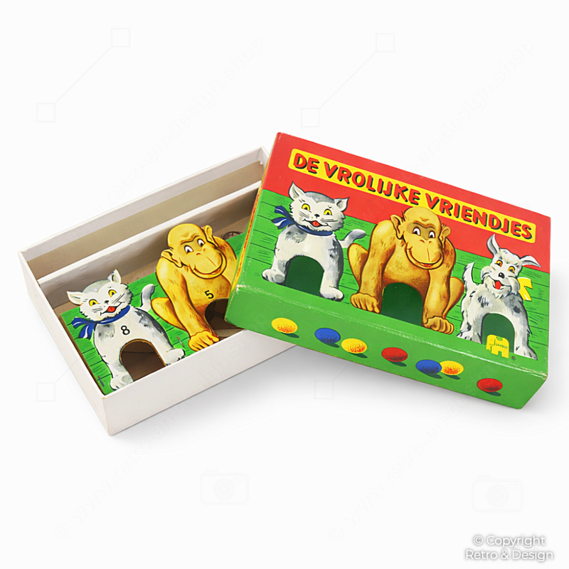De Vrolijke Vriendjes is een klassiek mikspel waarbij spelers knikkers proberen te schieten in de openingen van de dierenfiguren. Elk doel vertegenwoordigt een aantal punten – wie aan het einde de meeste punten verzamelt, wint het spel.