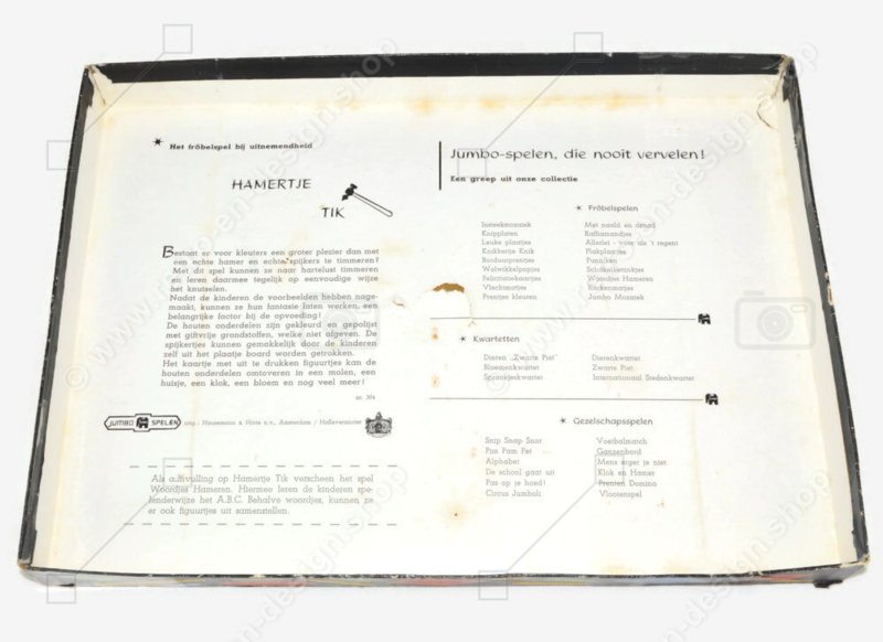 Bij dit handvaardigheidsspel zijn de originele onderdelen bijgevuld met nieuwere, zoals plastic onderdelen en een extra hamertje. Het Jumbo logo is het oude logo in geel en zwart met de hoofdletters HH in het olifantje.