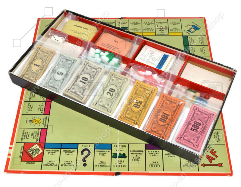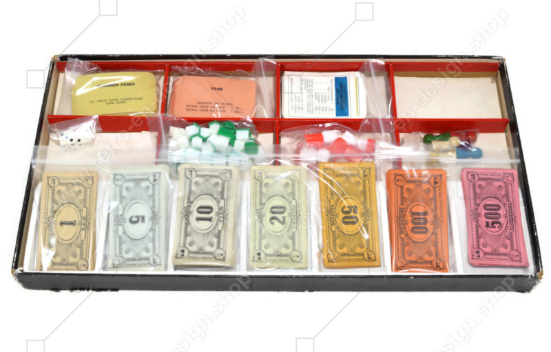 - In de doos zit een "plastic kassa" bestaande uit een witte plastic inlage met 7 vakjes voor de bankbiljetten. De overige ruimte is door rode schotjes in 8 vakken verdeeld.