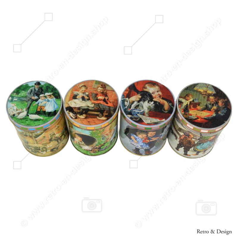 Deze set van vier blikken verkeert in een goede vintage staat met normale sporen van gebruik en aan leeftijd gerelateerde sporen van slijtage. Foto's maken deel uit van de beschrijving.