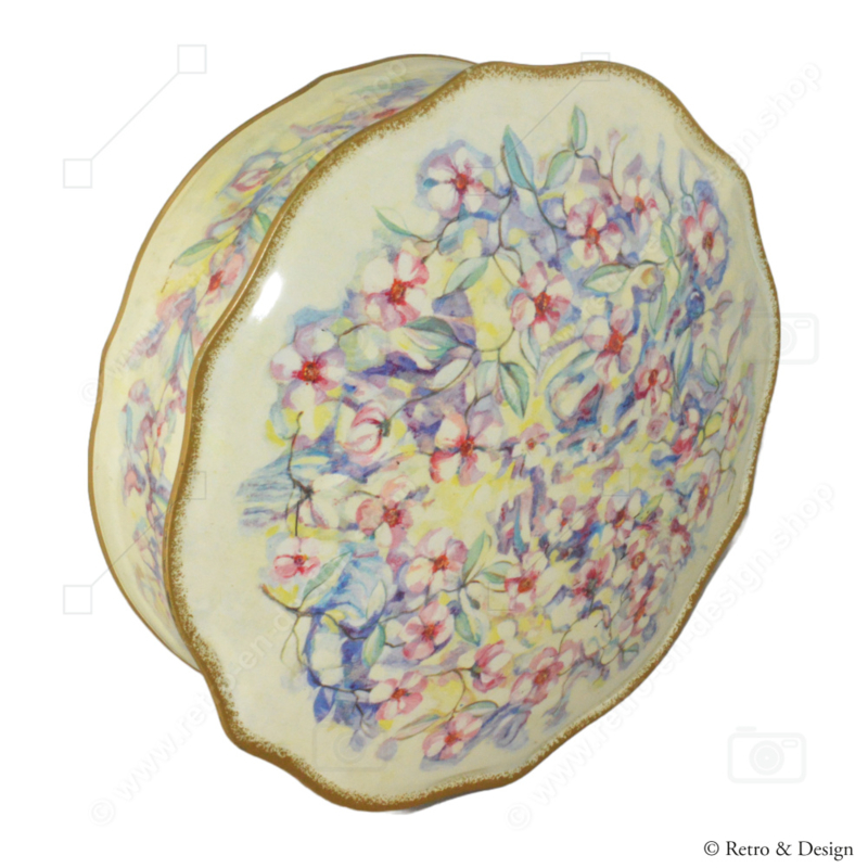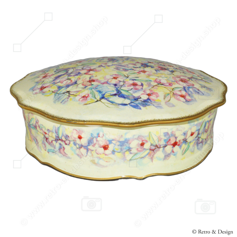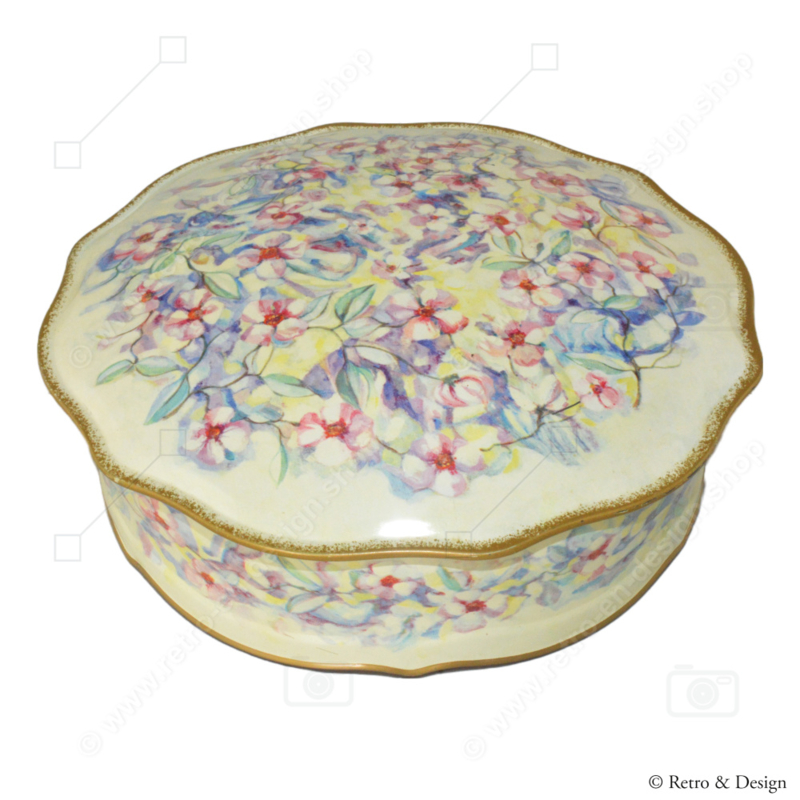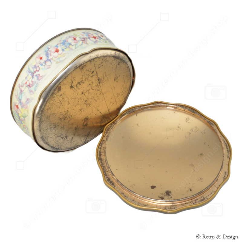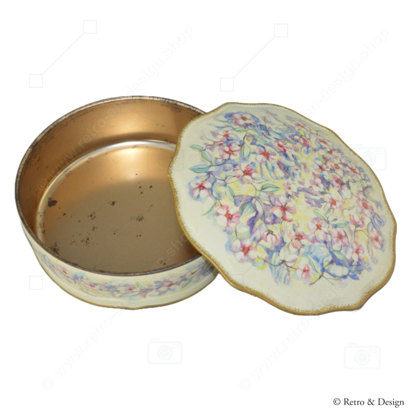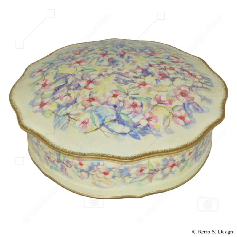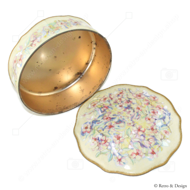 Het crèmekleurige bloemendecor, geaquarelleerd in zachte tinten van roze en paars, creëert een dromerige sfeer. De gouden rand omlijst het deksel en geeft het blik een vleugje luxe. Dit blik is niet alleen een praktische opbergoplossing, maar ook een kunstwerk op zich.