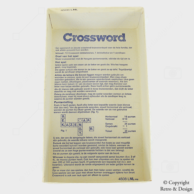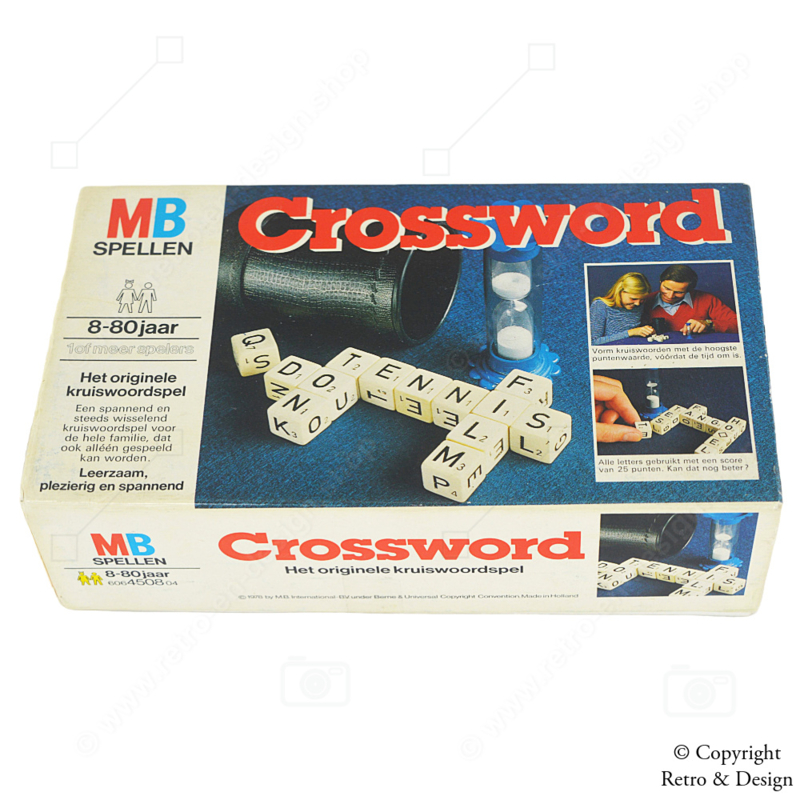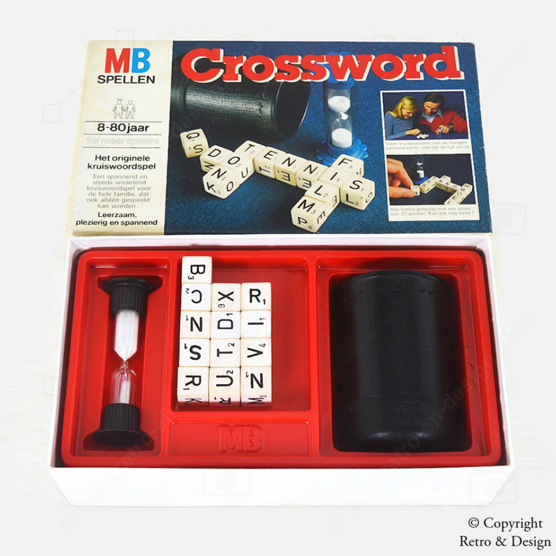 Het Crossword spel van MB uit 1978 is een vintage bordspel waarin spelers met dobbelstenen letters woorden moeten vormen binnen een tijdslimiet, vergelijkbaar met een kruiswoordraadsel.